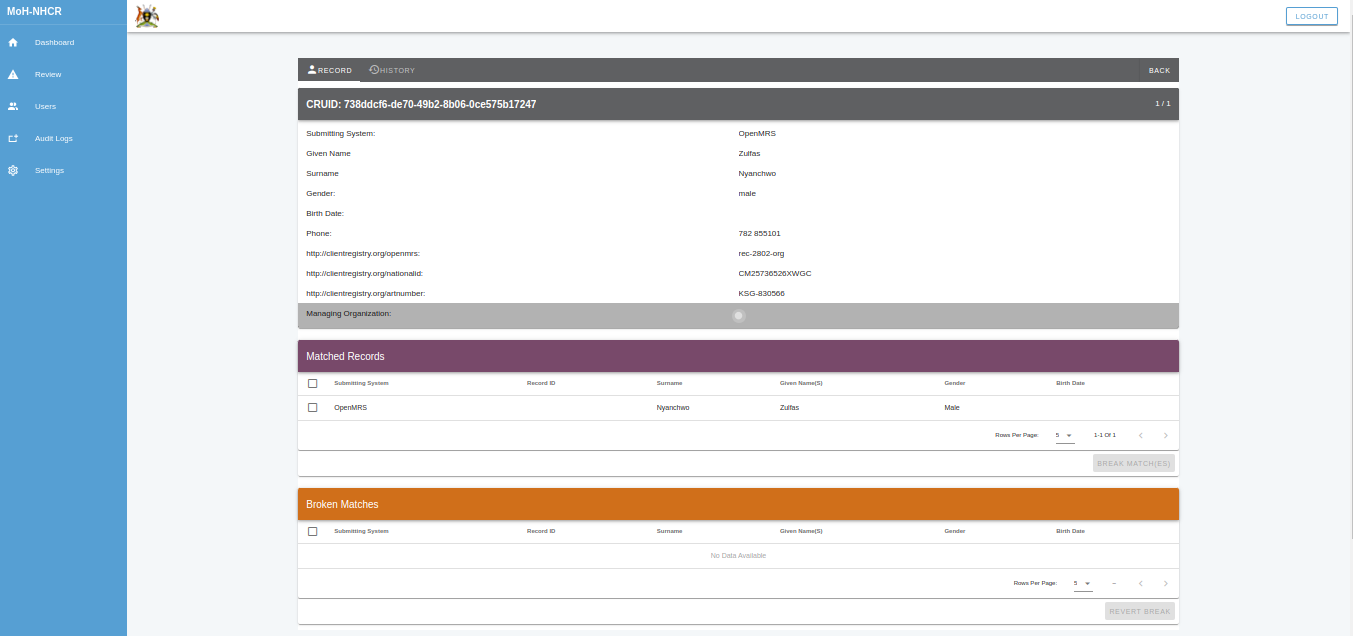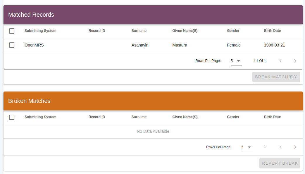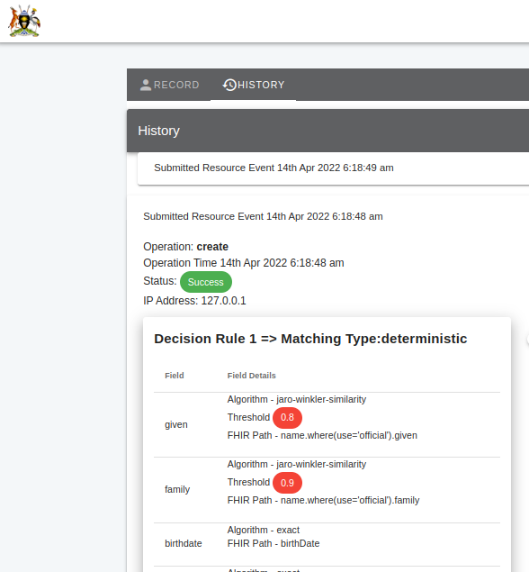 - Bottom of the page: A history of all events affected the record, including creation, modification, and the decision rules used to make the matches.