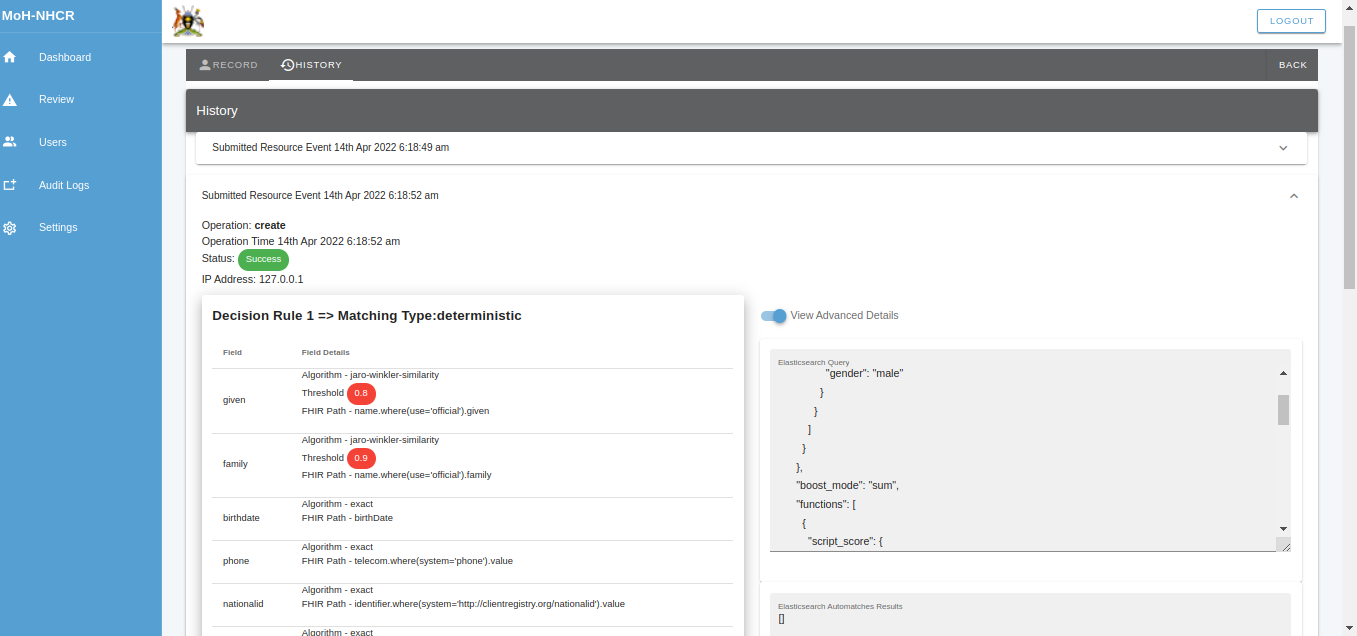 The history card shows the set of decision rules and overall submission information about each history event. All events include any decision rules that were used to make those matches and the specific ElasticSearch query.